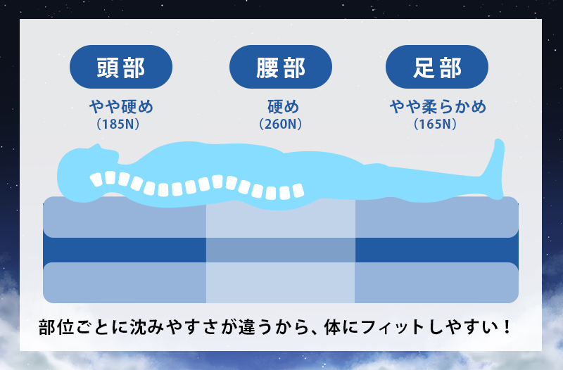 体圧分散性とは、寝ている間に体にかかる圧力を全体に分散させ、特定の部位への負担を和らげる性質のことです。これにより、 腰や肩の痛みを防ぎ、朝まで快適な眠りをサポートします。